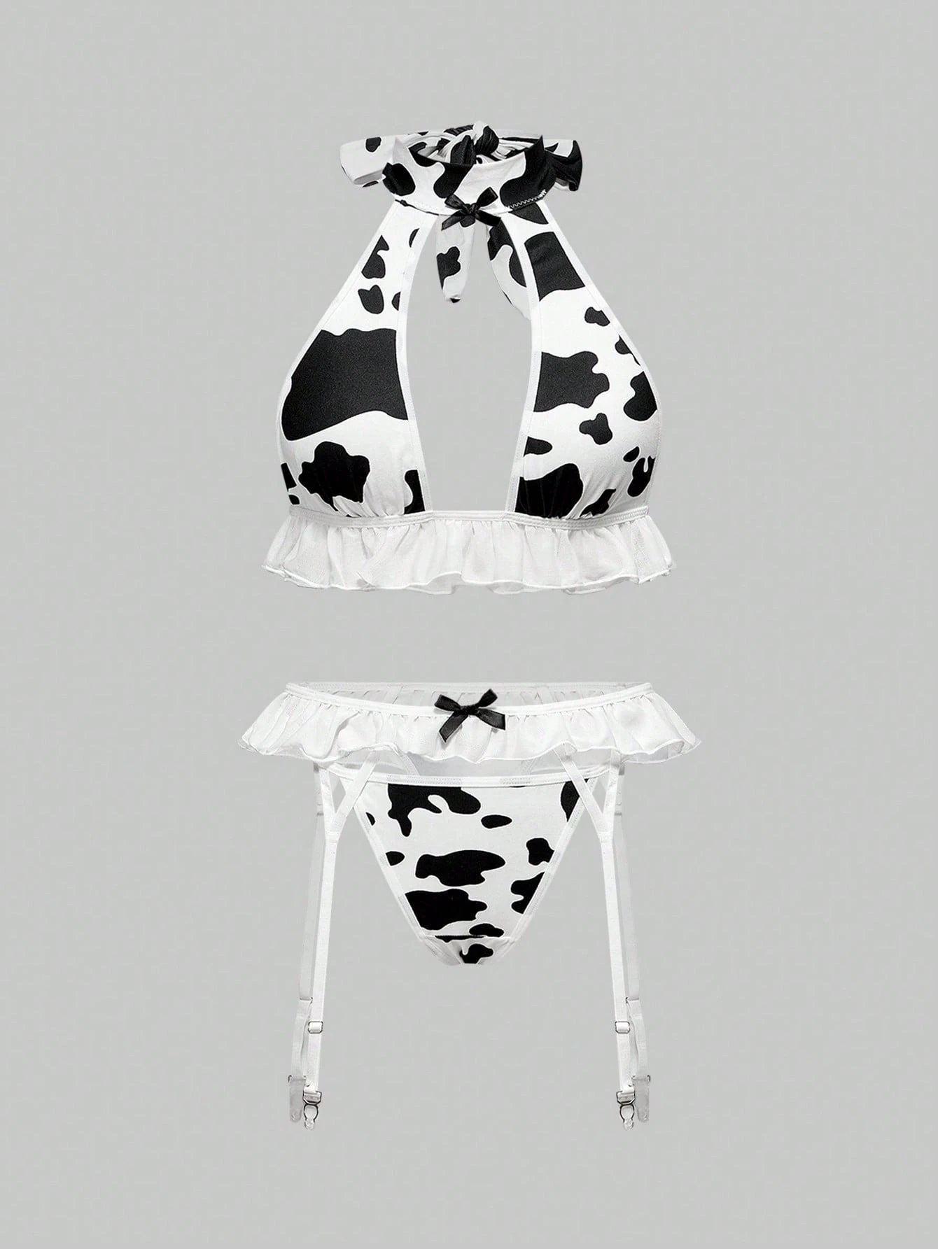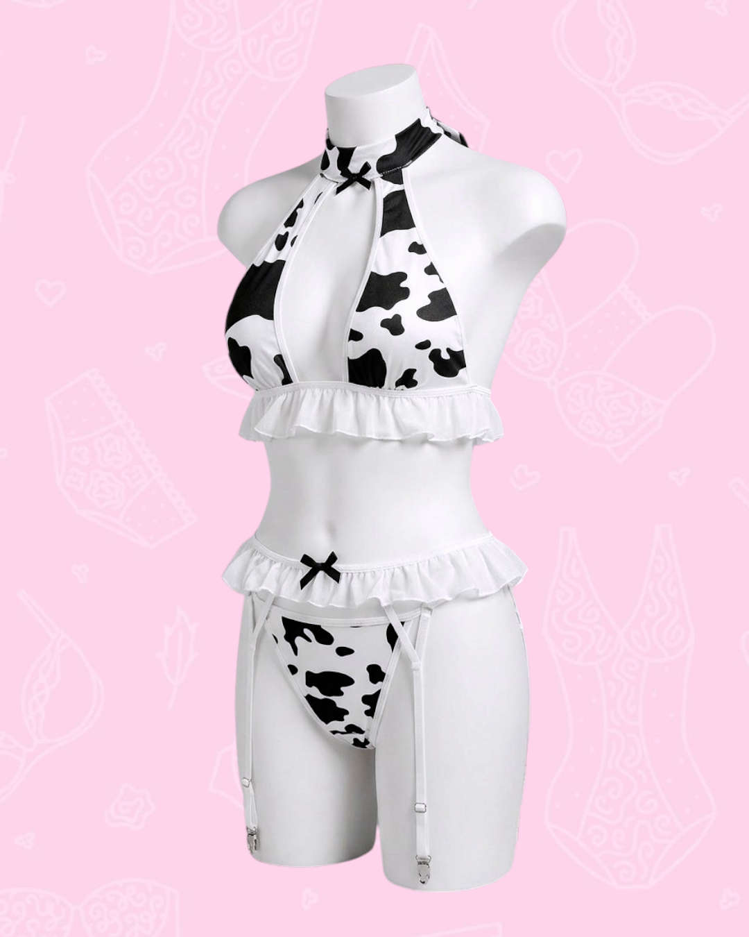 Set de estampado de vaca con detalles de arruches para llevar lo adorable a otro nivel 🐮 En tela elástica y suave. El liguero incluye ganchos si quiere usarse con medias
